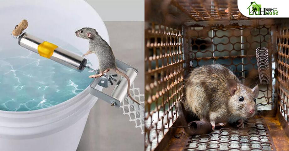 ใช้ถังน้ำและไม้พาดใส่เหยื่อล่อ เมื่อหนูขึ้นไปจะพลัดตกลงไปในถัง